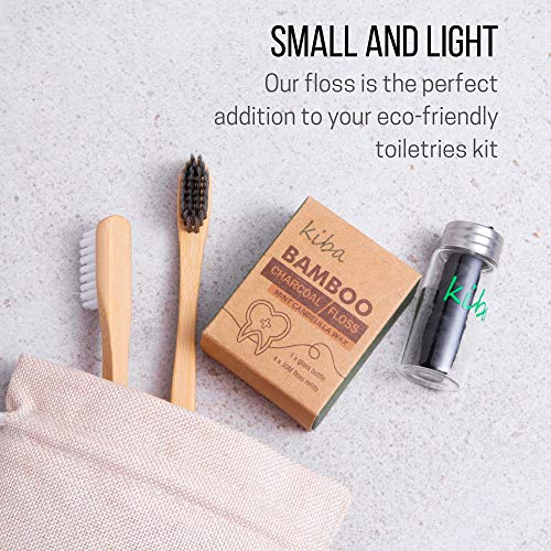 Kiba Bamboo Charcoal Floss w/Reusable Floss Container 5 pc Kit (1 Glass Floss Container + 4x30m Dental Floss Refills) – Eco Friendly Floss w/Candelilla Wax – Mint – Vegan