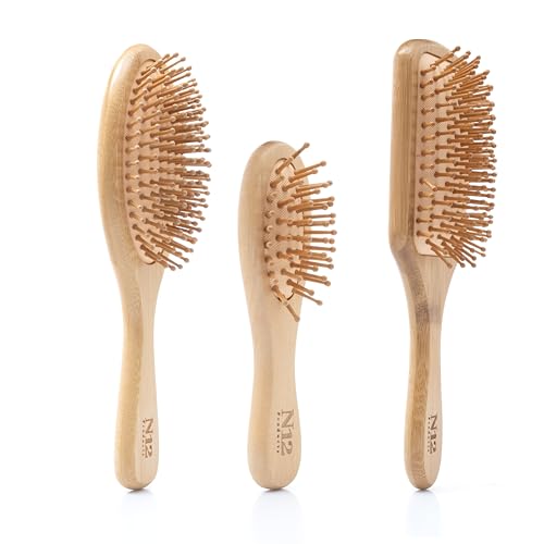 Set of 3 Bamboo hair brush sets for women men eco and kids friendly anti-static scalp massage, detangling styling frizz control breakage reduction & sustainable qualities knot-free hair