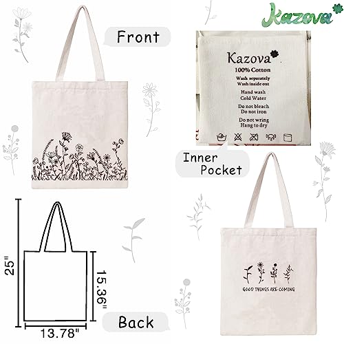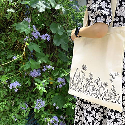 Kazova Floral Cotton Canvas Tote Bag Minimalist Flowers Tote Bag Reusable Canvas Shopping Grocery Bags Wildflower Botanical Tote Bag Aesthetic Tote Bag