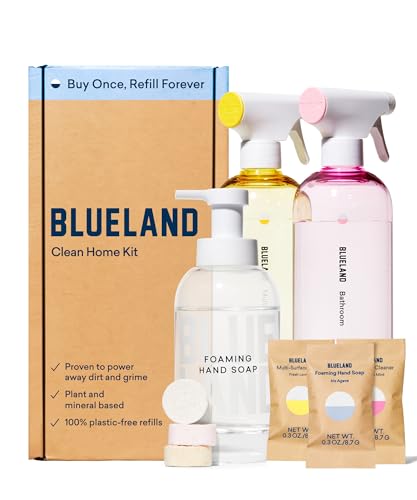 BLUELAND Clean Home Kit (3 Reusable Bottles + 3 Tablet Refills) Natural All Purpose Cleaner for Kitchen and Counters, Bathroom Cleaner for Shower and Sink, and Foaming Hand Soap