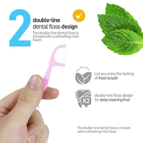 Advanced Oral Care: Pink Dental Floss Travel Case includes 52 mint-flavored dual-line flossers toothpicks, designed to effectively remove plaque and improve your oral hygiene, making them essential tools for adults seeking a healthier smile.