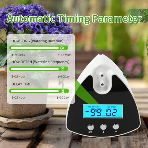 【Automatic timer function】 LCD screen, short press the SET key to enter the automatic watering parameters.”HOW LONG” can be set to 1-99 seconds /2-15 minutes, “HOW OFTEN” can be set to 1-23 hours /1-30 days, and “DELAY” can be set to 1-23 hours /1-30 days.After setting the parameters, you can short press the SET key to see how long it is until the next watering.