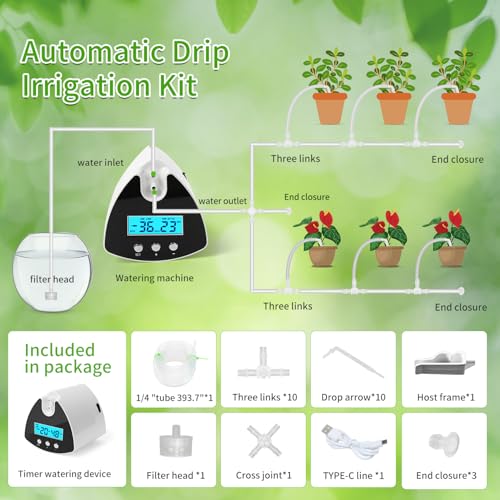 Specification: Automatic Plant Waterer Indoor,Potted Plant Watering Device,LED Display and self-Priming Pump, Drip Irrigation System Kit (10 Potted)