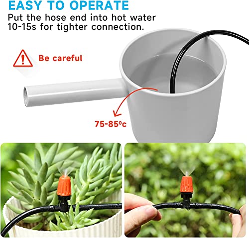 Easy Installation: No want to dig water pipes, just insert the accessories and drippers, you’ll be able to immediately start watering the plants. Please put the hose end into hot water for 10-15 seconds for tighter connection