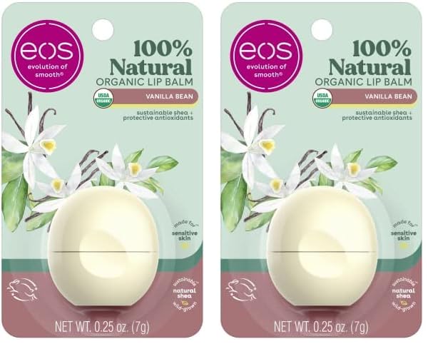 eos 100% Natural & Organic Lip Balm Sphere- Vanilla Bean, All-day Moisture, Dermatologist Recommended for Sensitive Skin, Lip Care Products, 0.25 oz (Pack of 2)