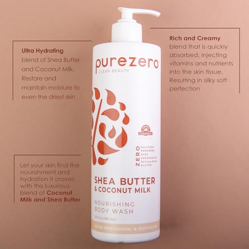 Purezero Shea Butter & Coconut Milk Body Wash, Leaves Skin Hydrated and Fresh, Maintain Elasticity and Smoothness, Zero Sulfates, Parabens, Dyes,100% Vegan & Cruelty-Free (20oz, 2 Pack)