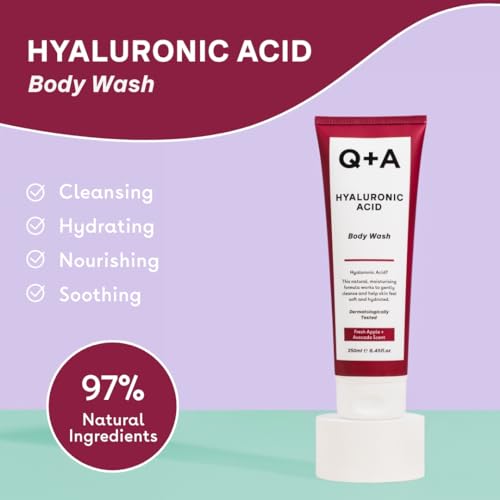 Specification: Q+A Hyaluronic Acid Body Wash, a blend of Hyaluronic Acid, Giant Kelp Extract and Saccharide Isomerate, and a fresh Apple and Avocado scent 250ml