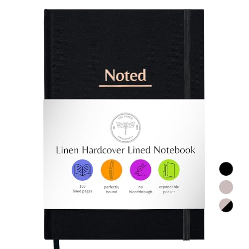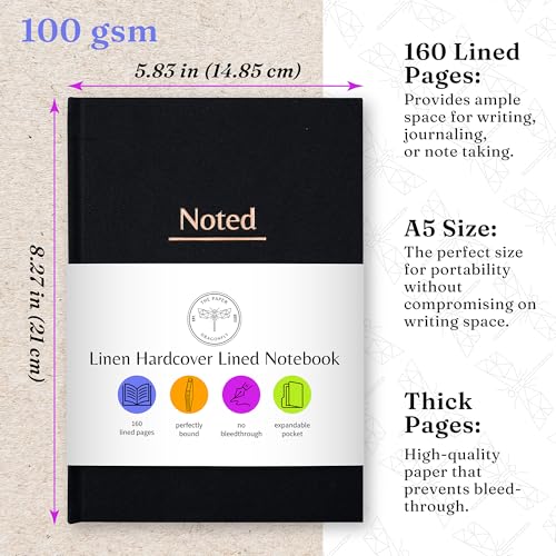 Specification: Lined Journal Notebook for Women & Men – 160 Pages, A5 Size 5.8 inches x 8.3 inches Linen Hardcover Notebook Journal for Work, Writing, and Note Taking with Thick 100 GSM Paper, Elastic Band, Lies Flat, Satin Bookmark, Expandable Pocket – Black