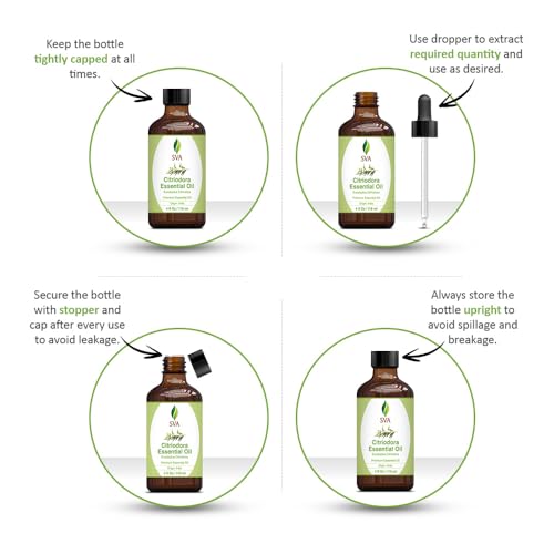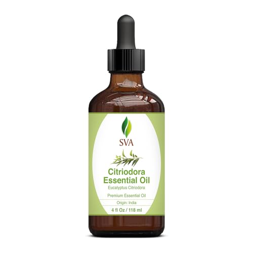 Premium Quality Citriodora Essential Oil: SVA Citriodora Oil essential oil 4oz is obtained by steam distillation of Eucalyptus Citriodora leaves. Our Citriodora oil is free of preservatives and comes with a dropper for easy application. It is not tested on Animals. We care for you