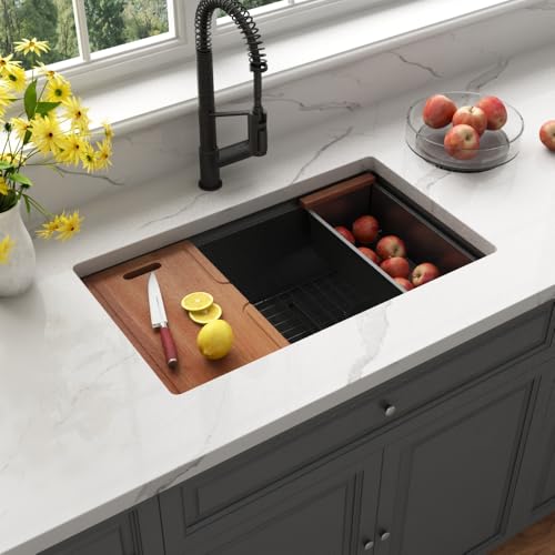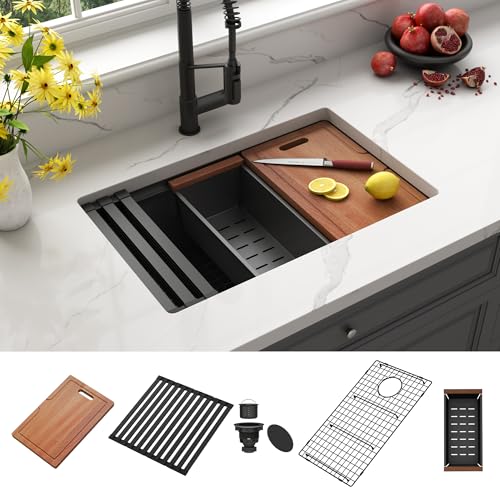 Specification: Black Undermount Kitchen Sink, Single Bowl Stainless Steel Kitchen Sink, 10 Inch Depth Multifunctional Workstation Handmade Kitchen Sinks with Accessories (28×18 inch)