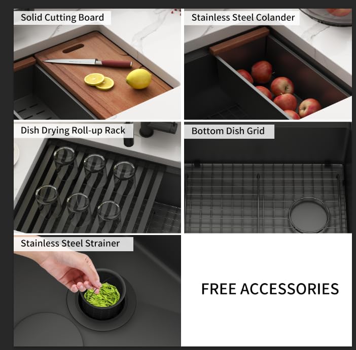 Includes Black Kitchen Sink Accessories: sink, kitchen sink strainer, drying rack, cutting board, grill, kitchen sink strainer collects food debris within the sink and down the drain