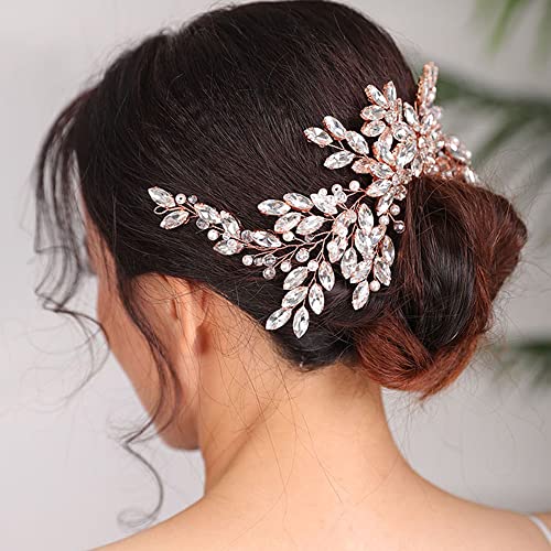 Wedding Rose Gold Hair Comb with Rhinestone Crystal Flower for Bridal Headpieces, Handmade Accessories for Women and Girls (ROSE GOLD)