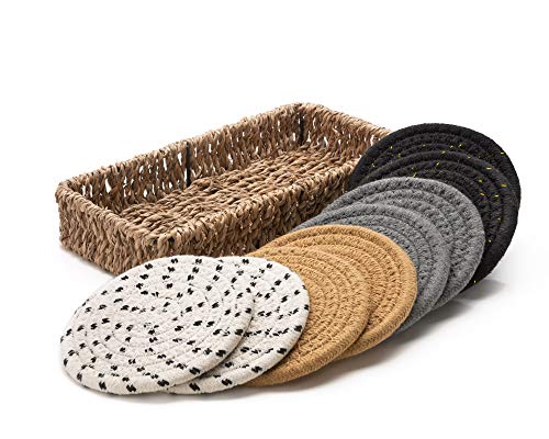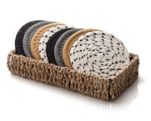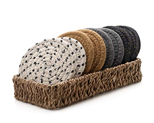 Boho Drink Coasters with Seagrass Basket Holder for Storage | Set of 8 Handmade Braided Cotton 4.3 Inch Extra Absorbent Coasters in Boho Decor Neutral Colors | 100% Natural Eco Friendly Coaster Set