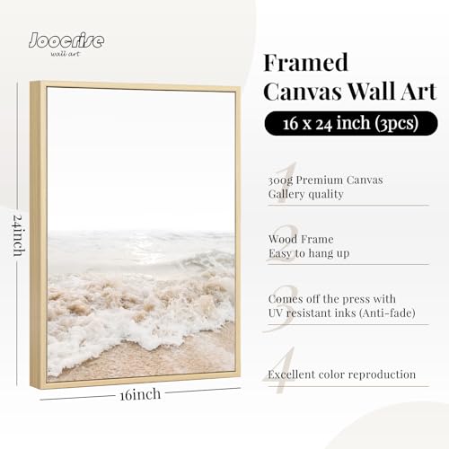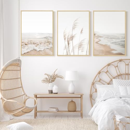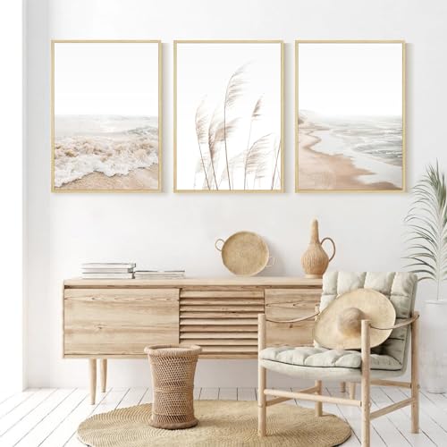 Beach Wall Art Boho Prints Coastal Canvas Wall Art FRAMED, Beach Pictures Wall Art Pampas Grass Ocean Poster Plant Landscape Beach Scene Artwork for Living Room Bedroom Decor 16×24 Inch, Set of 3