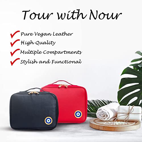 Discover style and convenience with the Tour with Nour Pure Vegan Leather Makeup Bag, an essential for travelers and beauty enthusiasts. This Cosmetic Professional Organizer seamlessly blends fashion and serve as, marrying the allure of a Makeup Train Case with the practicality of an Artist Storage Bag.