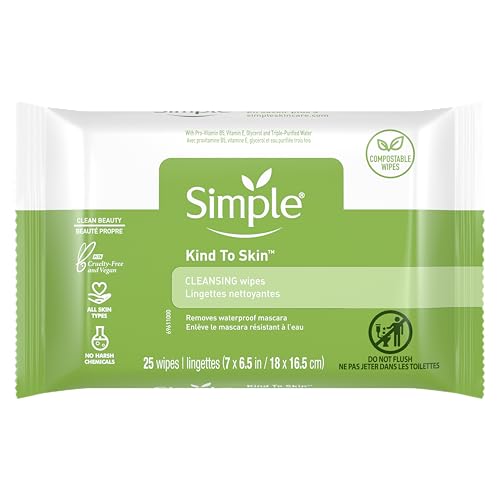Everyday cleansing can also be harsh on skin. Simple Kind to Skin Cleansing Facial Wipes are merciless on makeup but softer than silk and super gentle designed for sensitive skin. These improved makeup remover wipes are made of softer-than-silk fibers gentle cleansers purified water and Skin-loving ingredients like Vitamin B5 and vitamin E. They lift away dirt grease impurities makeup — even waterproof mascara — effectively even as hydrating and nourishing skin. Our formula contains no dyes artificial perfumes or harsh chemicals that can lead to skin irritation or clogged pores making it a great face wipe for sensitive skin. Simple Facial Wipes are Dermatologist tested and approved hypoallergenic and non-comedogenic. For best results gently wipe Simple Facial Wipes over eyelids face neck and even lips to cleanse the skin. To remove stubborn mascara hold a wipe over your closed eyes for a couple of seconds before gently wiping away. Throw used wipes in the bin do not flush. Stop your wipes from drying out by resealing the pack. Throw used wiped in the bin after use do not flush down the toilet the environment will be thankful for it. We are committed to a cleaner future. Our commitment to being cleaner is about holding ourselves to a higher standard and discovering new how one can create effective skincare products that do what they say even as being kind to your skin and the planet. We imagine in often working to be kinder to the planet. That’s why Simple is certified Cruelty-Free by PETA meaning we do not test on animals anywhere on the earth.