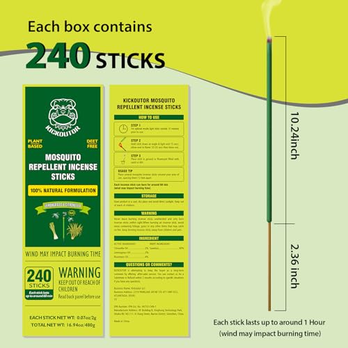 Specification: Mosquito Repellent Outdoor Patio 240 PCS Natural Citronella Incense Sticks DEET Free Lemongrass Oil Gnat Mosquito Control for Indoor Backyard Travel Camping