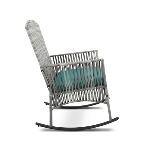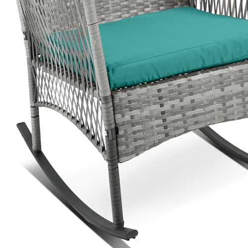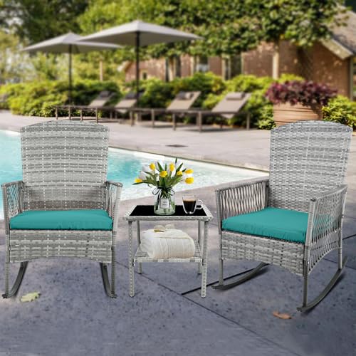 Specification: 3 Piece Patio Conversation Set, Outdoor Rocking Chairs Set of 2, Wicker Furniture Set with Glass Top Coffee Table and Cushions for Porch Garden Backyard Lawn (Grey Rattan, Blue Cushion)
