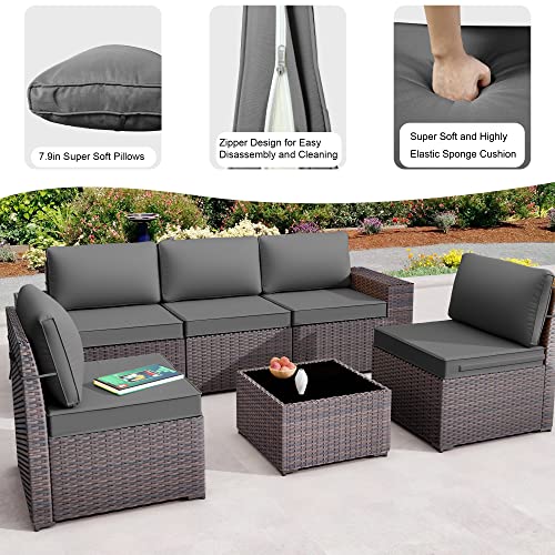 6 Pieces Waterproof Outdoor Patio Set, Modern All-Weather Outdoor Patio Furniture Sets with 5 Black&Brown Chairs. Outdoor Sectional Sofa for Garden/Backyard/Balcony(Grey)