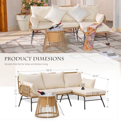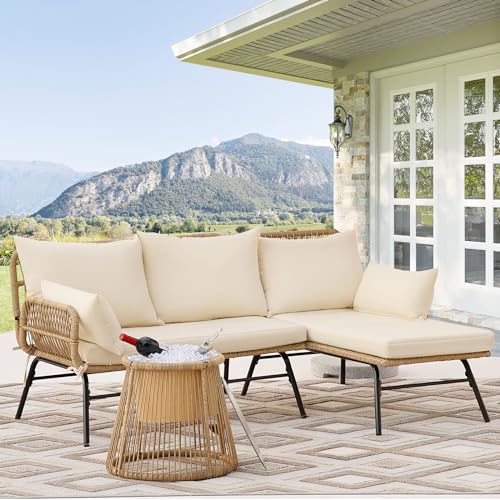 Specification: BULEXYARD Set of 3 Boho Outdoor Patio Furniture Sets with Round Tempered Glass Table, Small Size L Shape Wicker Conversation Sectional Sofa Sets for Backyard, Porch, Deck, Garden, Balcony