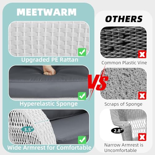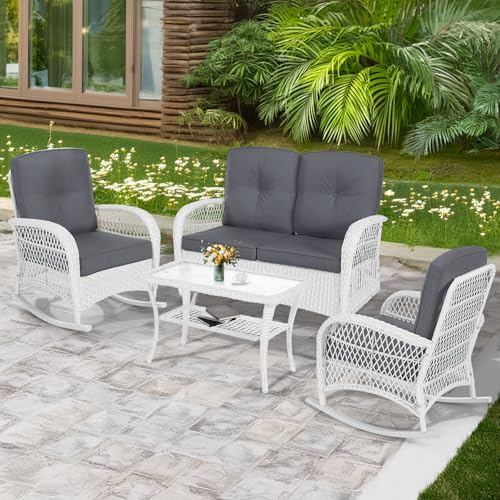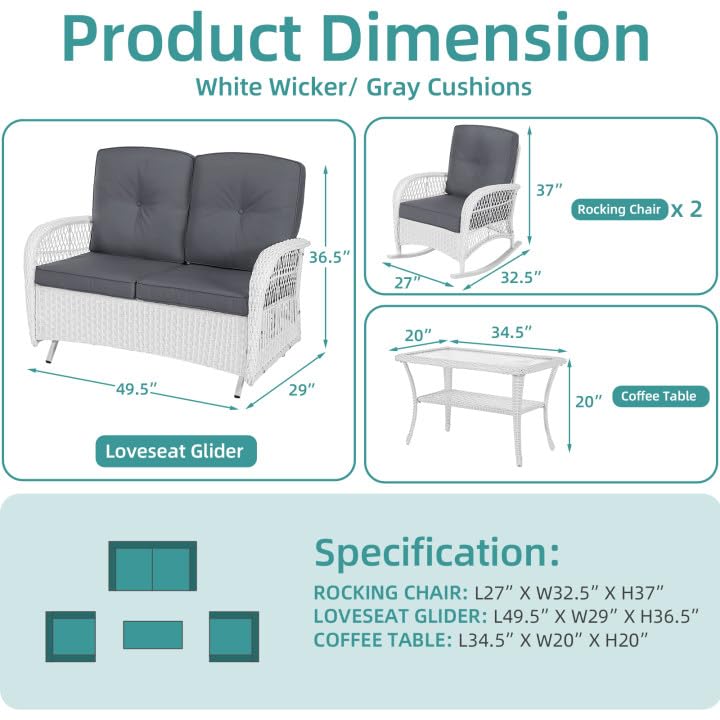 Specification: MEETWARM 4 Pieces Outdoor Wicker Patio Conversation Sets with Glider Loveseat, 2 Chairs with Coffee Table Wicker Rocking Chair Set, Patio Furniture Set with Thickened Cushions, White Wicker/Grey