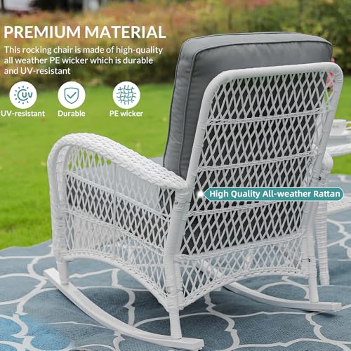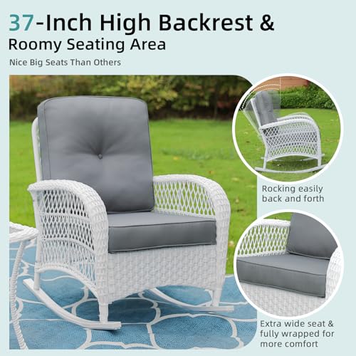 MEETWARM 4 Pieces Outdoor Wicker Patio Conversation Sets with Glider Loveseat, 2 Chairs with Coffee Table Wicker Rocking Chair Set, Patio Furniture Set with Thickened Cushions, White Wicker/Grey