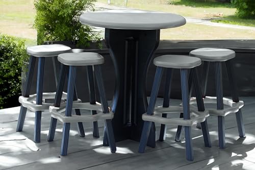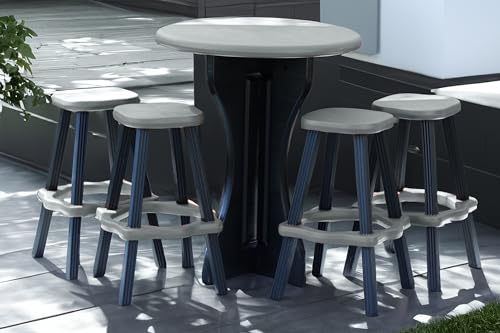 Specification: Patio Table Set with Four Barstools – Black Base with Deep Grey Accents – Perfect for Patio and Outdoor Spaces. Hardware Free Easy Assembly. Proudly Made in USA