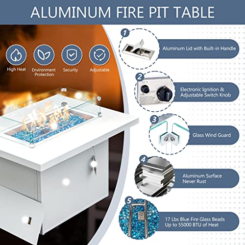 RADIATA 11pcs Modern Aluminum Patio Furniture Set with 43” Propane Fire Pit Table (White)