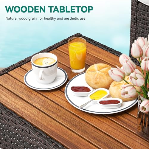 Centerpiece Coffee Table: The coffee table in the outdoor bistro set features a wooden top blended with all-weather wicker edging for elegance and durability; Supporting up to 75 lbs, it can hold your drinks, snacks, or decorative items during outdoor events