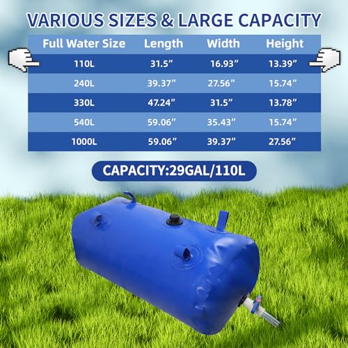 Specification: 29gal Water Storage Bladder with Valve,Portable Large Capacity Water Tank,Collapsible Rain Barrel & Water Storage Container,for Camping,Fire Protection, Agricultural Irrigation & Emergency Water(110L)
