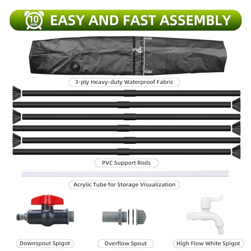 【Durable and Sturdy】Crafted from durable 3-ply PVC materials, our collapsible rain catchment system are engineered for enduring strength, capable of withstanding the harshest elements.For added stability, our rain barrels feature stiff fiberglass rod, effectively getting rid of any wobbling or tipping issues.