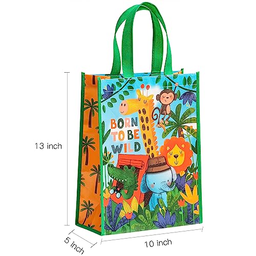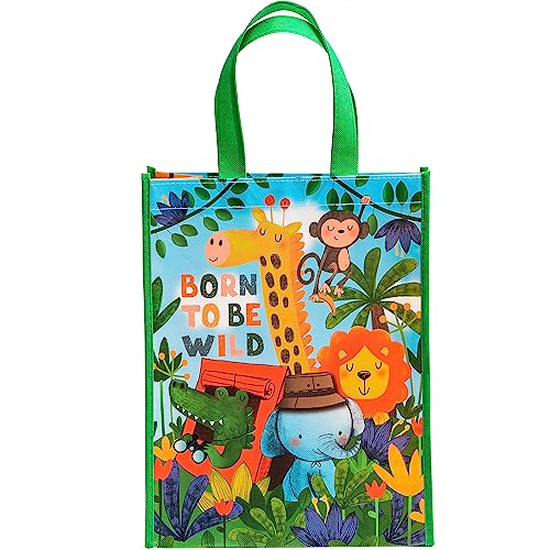 UNIQUE DESIGN: Gift bag features vivid colorful fun patterns with lion, elephant, crocodile, monkey and giraffe in the forest,”BORN TO BE WILD”lettering printed on a blue background. Our unique designs make our gift bags perfect for kids!