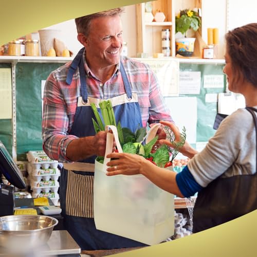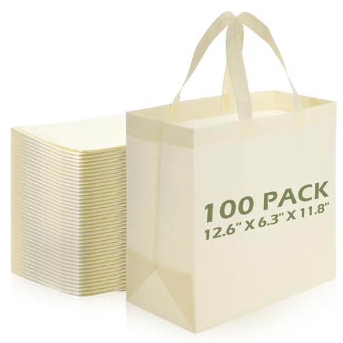 Specification: Reginary 100 PCS Reusable Totes Bag Bulk, Non Woven Grocery Handle Bag Portable Bag for Shop Events Retail Store(Beige)