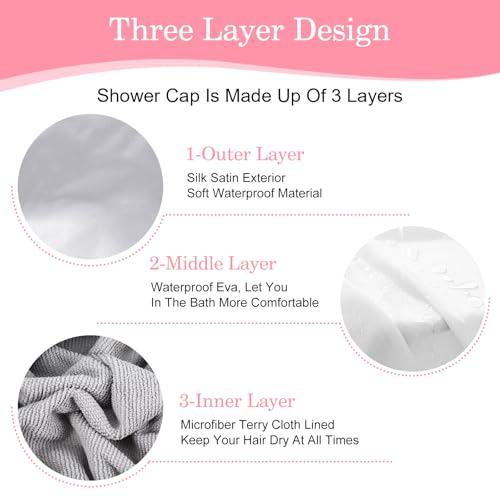 TRIPLE LAYER SHOWER CAP: The waterproof shower cap is made of three layers, the outer layer is satin, middle layer is waterproof EVA cloth, and the inner layer is terry cloth that absorbs water and steam to prevent frizz
