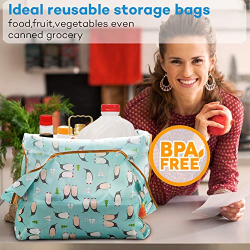 Measuring 14.96” (L) x 4.72” (W) x 13.77” (H), these totes are bigger and much sturdier than plastic grocery bags. Able to hold a ton with 1 trip which is equivalent to 2 trips from side to side from the car to the store with plastic bag for grocery shopping. And no worry about it getting dirty for the nylon material that can be washed and dry quick.