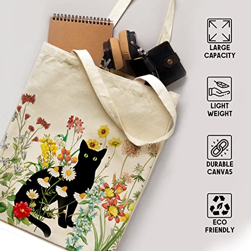 bmuvghi Black Cat Canvas Tote Bag with Zipper Pockets Vintage Flowers Cute Tote Bag Aesthetic Reusable Shopping Grocery Bags Birthday Gifts for Women