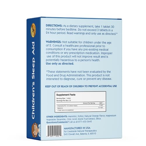 Specification: Creekside Naturals Children’s Sleep Aid, with Melatonin and Chamomile, Zero Sugar, Vegan, Pediatrician Formulated, Orange Dream Flavor, 30 EZ Melt Tablets