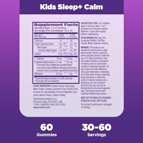 Specification: Natrol Kids Sleep+ Calm, Melatonin and L-Theanine, Sleep Aid Gummies with Botancial Blends, 100% Drug-Free, 60 Count (Pack of 2)