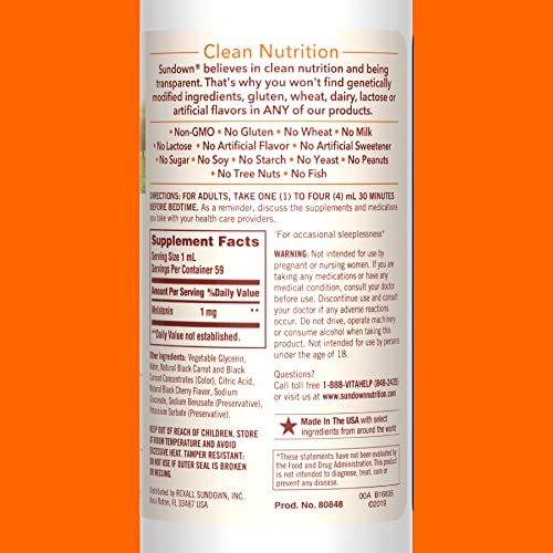 Sundown Liquid Melatonin is a convenient, drug-free way to improve sound, quality sleep. (2) When it gets dark, your body naturally produces Melatonin—often referred to as the sleep hormone—that can assist you prepare for sleep. Sundown Melatonin can be taken as a sleep aid to help with occasional sleeplessness or jet lag—so you’ll fall asleep faster, sleep longer, and wake up feeling refreshed. (2) This great-tasting cherry flavored liquid is fast-acting and ideal for many who have difficulty swallowing tablets and capsules. For adults, take one (1) to four (4) mL 30 minutes before bedtime. Each mL contains 1 mg of Melatonin. At Sundown, we imagine in living clean (1)…and being transparent. That’s why you won’t find genetically modified ingredients, gluten, dairy, or artificial flavors in any of our products. Choose Sundown for premium clean vitamins, without the premium price. (1) Contains 2 fl oz (59 mL) of liquid Melatonin.