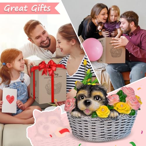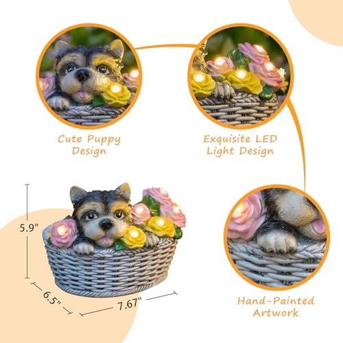 {Unique Gifts Solar Dog Statues}: The Puppy solar garden statues design with 8 Warm White LED lights, surrounding by charming rose flowers with a lovely dog curled up in his basket and ticking its tongue. Once you see the adorable dog statues, it will help you relax and bring you a lot of fun and happy moment every day.