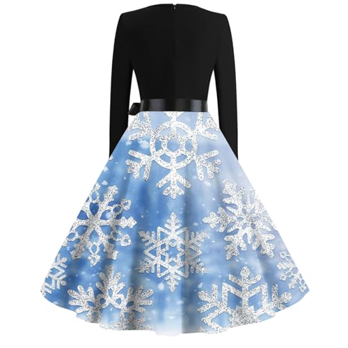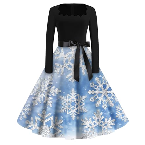 Womens Cocktail Dress for Christmas Party Square Neck Long Sleeve Bow Tie Belt Dresses Snowflake Plaid Xmas Dress