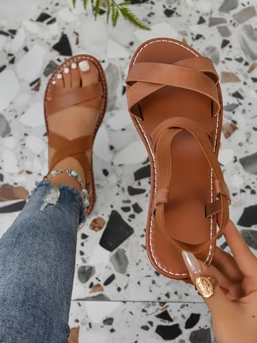 Floerns Women’s Flat Sandal Criss Cross Ankle Strap Leather Slip on Summer Shoes