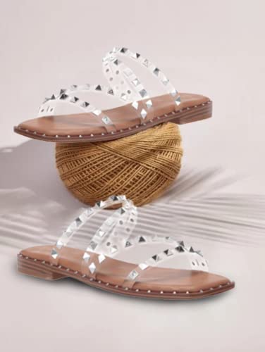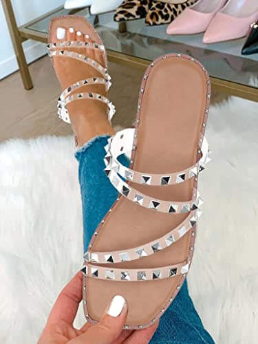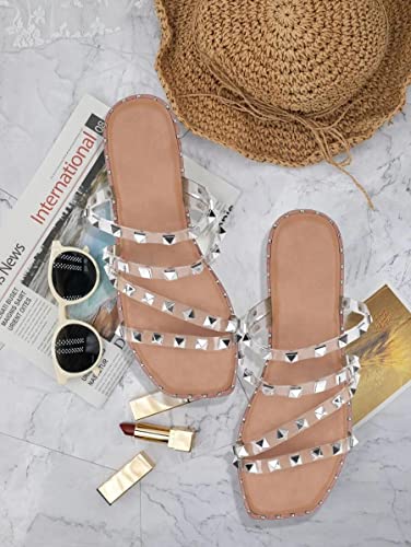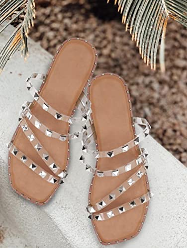 JeimPoey Womens Stud Slides Sandals Square Open Toe Strappy Flat Slide-on Mules