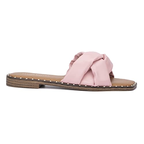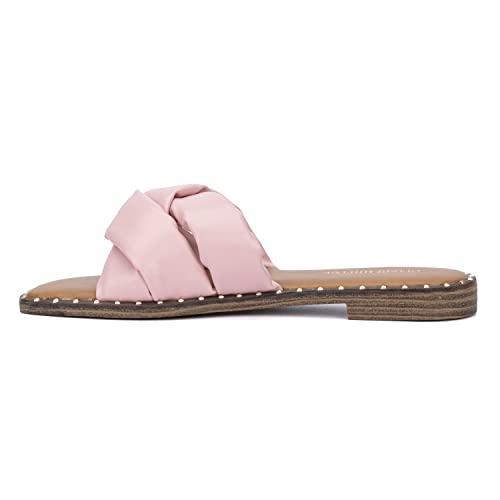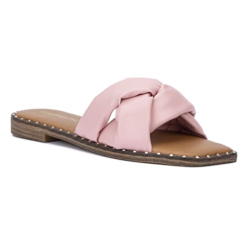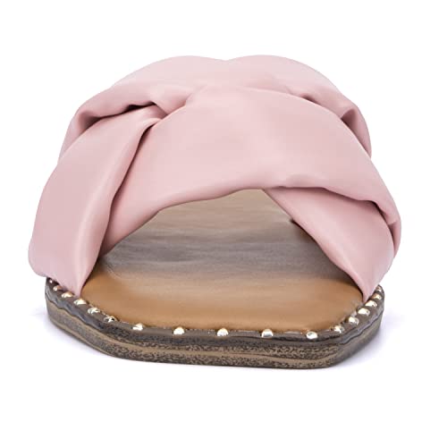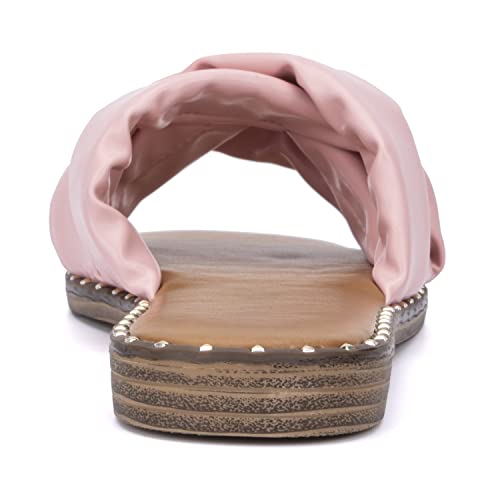 Olivia Miller Women’s Fashion Ladies Shoes, PU Vegan Leather w Criss Cross Wide Single Strap Slides Open Square Toe Trendy Casual Summer Slide Flat Sandals