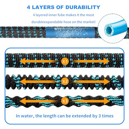 【3750D High Density Polyester Fabrics】:Expendable leak-proof garden hose outer tube is wrapped with 3750D high-density polyester material, and the inner tube is made of 4-layer high-density latex material, which has better durability, stretchability, and is lighter compared to the traditional TPE inner tube.Our expanding water hose can withstand temperature 41℉-113℉ and bear water pressure of 3-12 Bar.