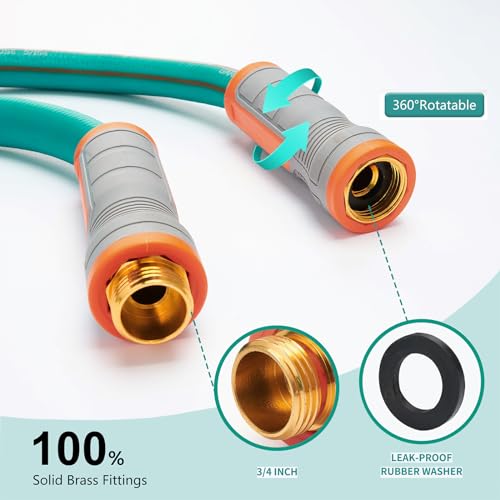 360-Degree Rotation – The handles on this garden hose 25 ft can rotate a full 360°, making it a breeze to water all your plants and lawn. Both ends of the heavy duty garden hose is made of 100% solid brass fittings of 3/4”, effectively prevents rust.