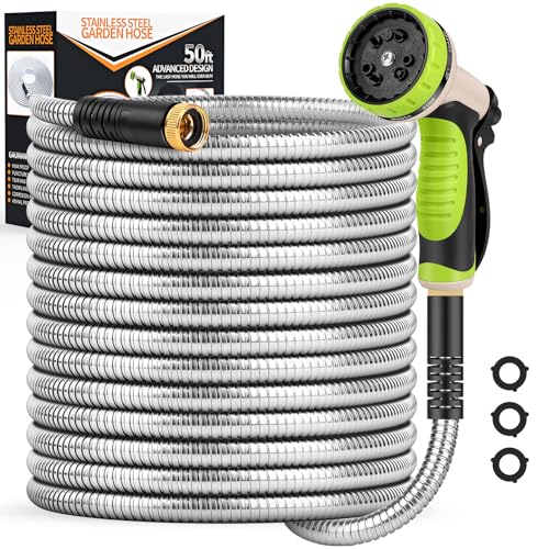 Specification: Garden Hose 50ft, Heavy Duty Stainless Steel Water Hose with 10 Functional Nozzles, No Kink, Lightweight and Flexible, Easy to Use and Store, Strong and Sturdy, Suitable for Yard and Lawn