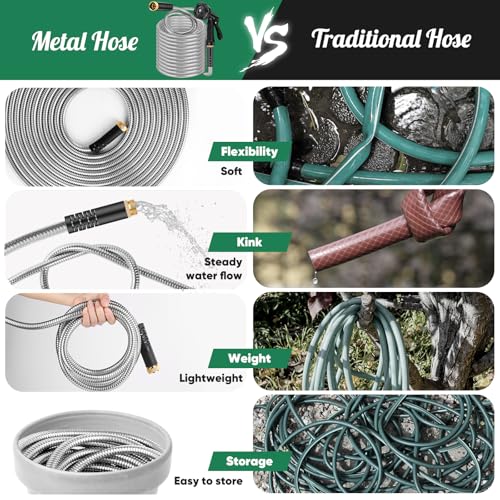 Flexible and Portable: The hose is lightweight, may also be easily carried to more than a few places. Soft and flexible, the smooth surface makes it easier to drag, saves effort in daily use and may also be rolled up for storage. Even after being dragged on muddy roads, the metal casing design makes this hose easier to clean, keeping your garden and house clean.