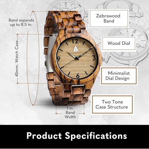 Specification: Treehut Wooden Watches for Men, Japanese Quartz Movement, Stylish Exotic Wrist Watch with Adjustable Stainless Steel Buckle, Wooden Straps, Watch Made from Zebrawood Wood, Relojes para Hombre