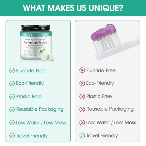 Remineralize and Offer protection to: Experience fluoride-free oral care with our nano hydroxyapatite toothpaste tablets. These toothpaste tabs improve enamel, remineralize teeth, and leave your mouth feeling minty fresh for long-lasting protection.